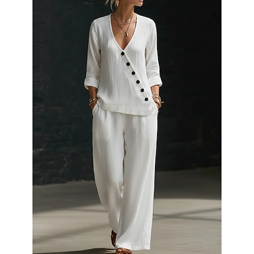 Per donna Set di Pantaloni Finto cotone e lino Manica Corta Scollo a V Tinta unica Moda Streetwear Casuale Quotidiano All'aperto Blu Nero Bianco Primavera Estate Vestibilità comoda