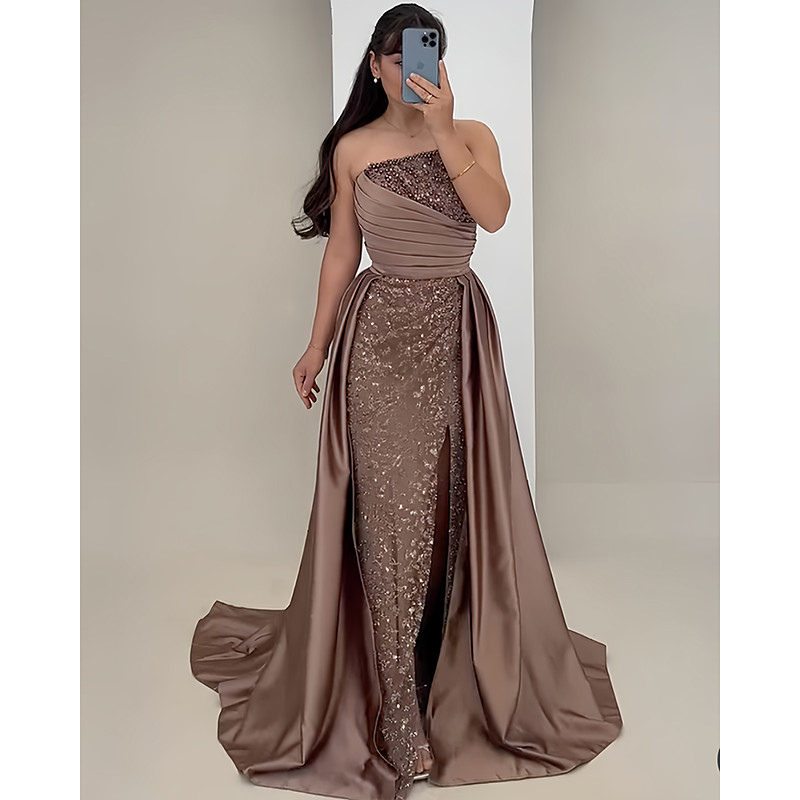 A-Line Mermaid Trumpet Floor Length Evening Gown Ball Gown with Overskirt Formal Dress Elegant Silky Sleeveless Strapless Wedding Formal Champagne Mother Of the Bride Dress Satin with Rhinestone