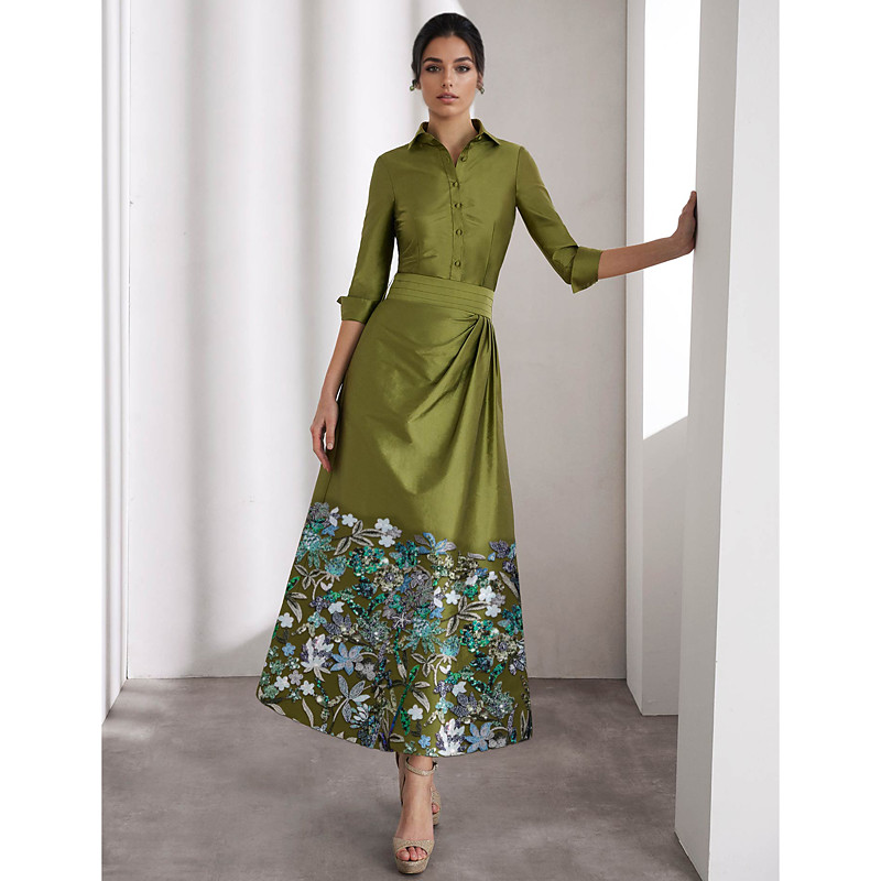 A-Line Floor Length Beaded Eembroidered Shirt Dress Party Dress Mother of the Bride Dress Long Sleeve Shirt Collar Elegant Vintage Wedding Formal Birthday Satin with Glitter Pocket