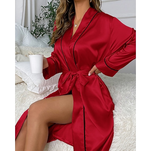 Per donna Accappatoio Casual Morbido Raso Colore Puro Allacciato Quotidiano Casa Da letto Manica Lunga Scollo a V Nero Bianco Champagne Rosa Vino Estate Primavera Vestibilità regolare Vestibilit