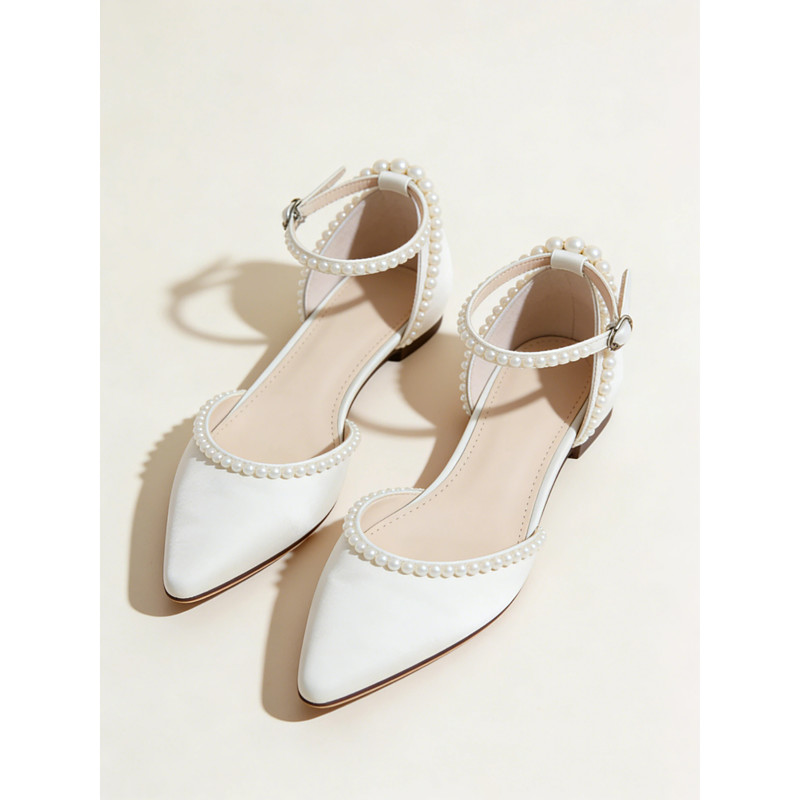 Women's White Pearl-Embellished Pointed Toe Flat Shoes with Ankle Strap - Perfect for Weddings and Formal Occasions