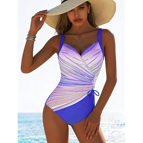 Costume da bagno intero da donna snellente arricciato alto e elegante vacanze grafiche a righe scollo a V senza maniche