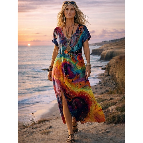 Per donna Abito maxi Abito Boho Vestito Casual Abito a trapezio Abito Stampato Vintage All'aperto Vacanza Weekend Vestibilità comoda Grafico Paisley Manica Corta Scollo a V Arcobaleno Estate Primavera