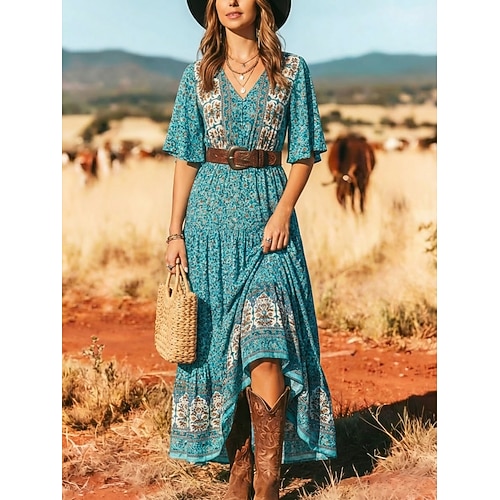Per donna Abito maxi Abito Boho Vestito Casual Abito Floreale Elegante Moda Moderno All'aperto Spiaggia Vacanza Vestibilità comoda Paisley Manica Corta Scollo a V Blu Nero Giallo Rosso Estate