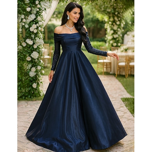 Abiti Formali Floor Length A-Line Abito da Sera Abiti Quinceanera Festa Elegante Maniche Lunghe Spalle Scoperte Sera Festa Matrimonio con Plissè e Perline