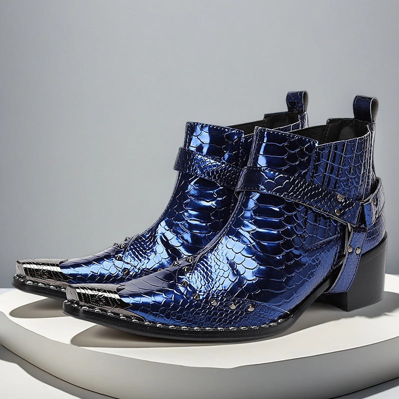 Men's Premium Cowhide Blue Croc Pattern Leather Chelsea Boots, Stylish Harley Motorcycle Boots for Rock Concerts, Parties, Nightclub Fashion and Stage Wear