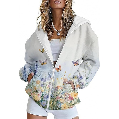 Per donna Giacca Casual Confortevole Tasca Stampato Sport Moda All'aperto Farfalla Casual Quotidiano Weekend Cerniera Regolare Con Cappuccio Vestibilità regolare Manica Lunga Capispalla Nero Azzurro
