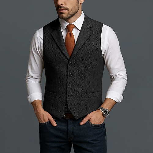 Per uomo Gilet Formale Matrimonio Vacanza Quotidiano Moda Classico Primavera Autunno Tasca Bottoni Lana Acrilico Confortevole Semplice Spina di Pesce Monopetto Bavero Vestibilità regolare Nero