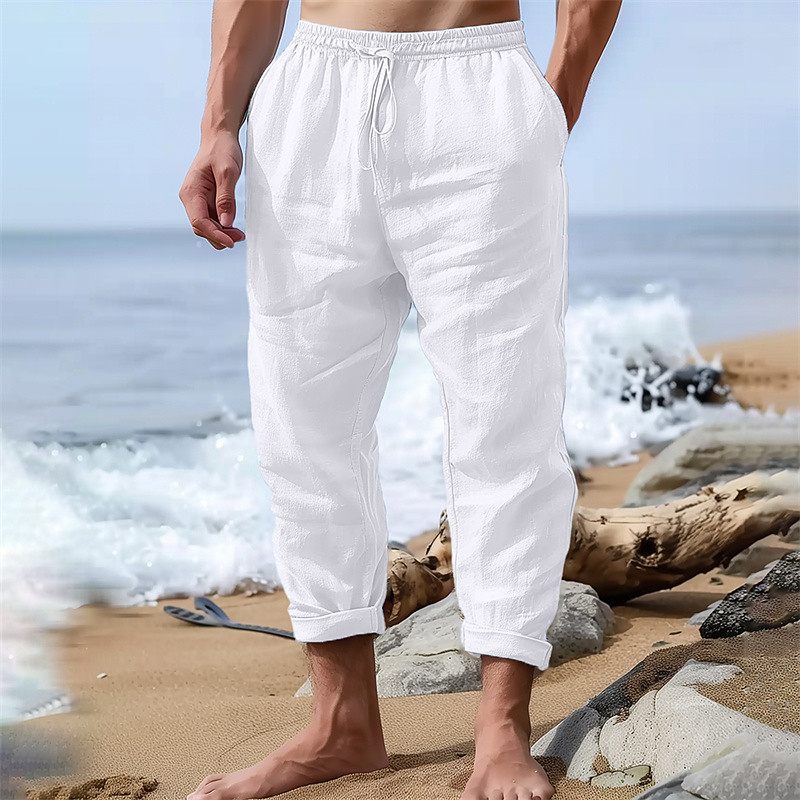 Men's Linen Pants Trousers Summer Pants Beach Pants Drawstring Elastic Waist Plain Comfort Breathable Daily Outdoor Beach Vacation Fashion Black White