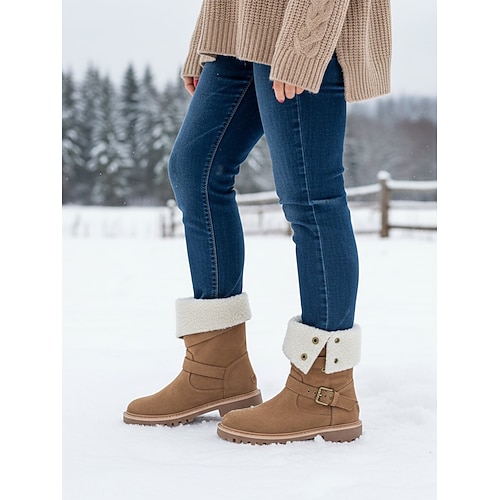 stivali da neve da donna in pelle scamosciata beige a metà polpaccio con cinturini con fibbia – stivali da motociclista invernali caldi con fodera in sherpa per la neve e i viaggi all'aperto