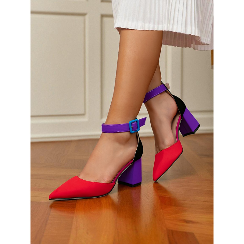 Women's 1950s Vintage Colorblock Block Heel Ankle Strap Pumps - Bright Pink, Orange, and Purple Pointed Toe Dress Shoes for Parties, Weddings, and Evening Events