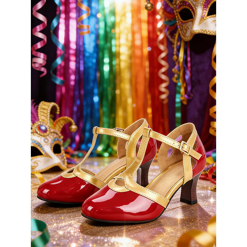 Women's Red and Gold T-Strap Heels with Metallic Accents Mary Jane– Perfect for Carnival, Festivals and Fun Celebrations