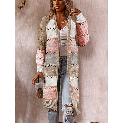 Damen Pullover Strickjacke Elegant Mode Streetwear Gestreift Öffnung vorne Tasche Gestrickt Langarm Lange Oberteile Stricken Outdoor Täglich Wochenende Schwarz Wein Frühling Herbst