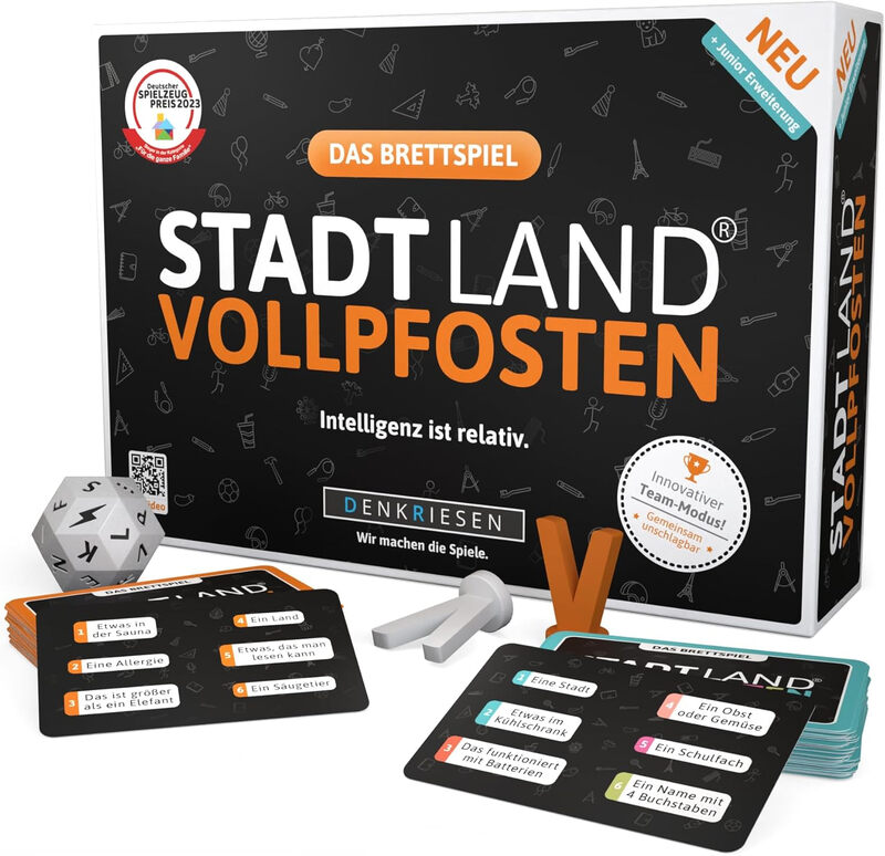 DENKRIESEN - Stadt Land Vollpfosten? Das Brettspiel | Basisspiel inklusive Junior-Erweiterung | Ab 8 Jahren | 4-12 Spieler | Partyspiel | Speed-Würfel & lange Spielrunden | Familienspiel