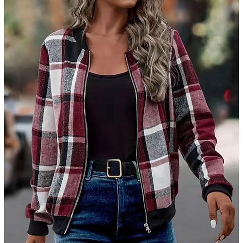 Per donna Giacca Invernale Antivento Caldo Cerniera Quotidiano Griglia Vacanza Casuale Regolare Collo alla coreana Vestibilità regolare Manica Lunga Capispalla Vino Rosso Verde Primavera Autunno