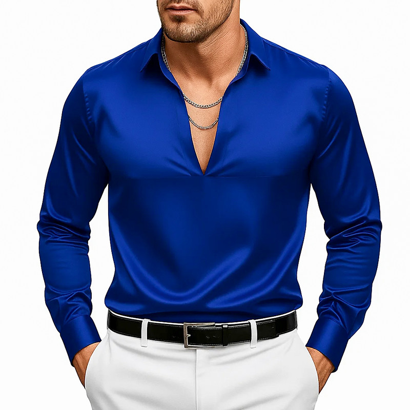 Men's Shirt Satin Shirt Dress Shirt Casual Shirt Button Up Shirt Prom Shirt Plain Formal Wedding Black Navy Blue Long Sleeve V Neck All Seasons Clothing Apparel