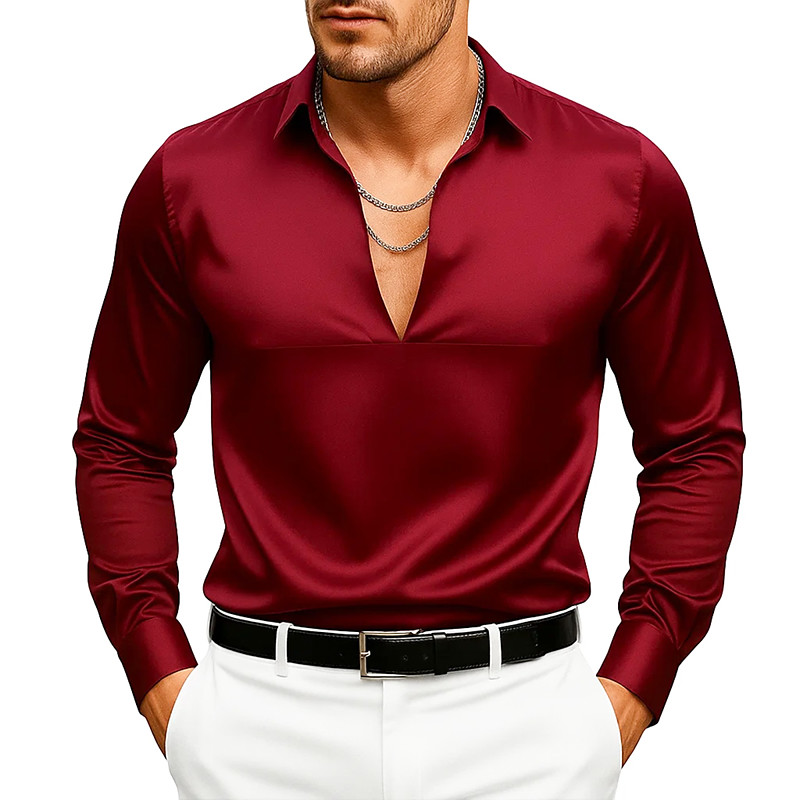 Men's Shirt Satin Shirt Dress Shirt Casual Shirt Button Up Shirt Prom Shirt Plain Formal Wedding Pink Wine Royal Blue Purple Long Sleeve V Neck All Seasons Clothing Apparel