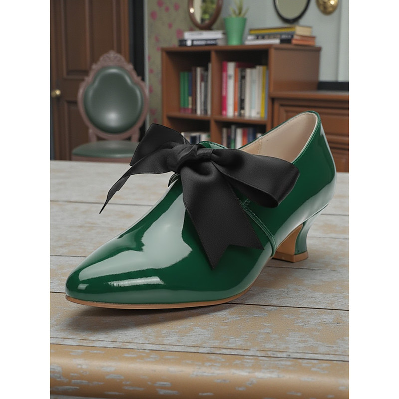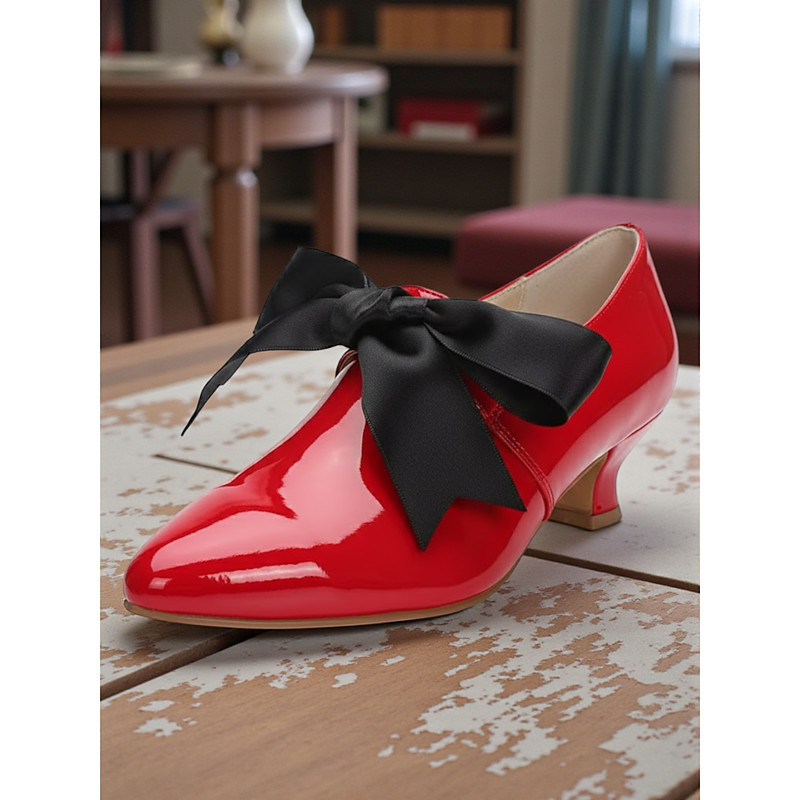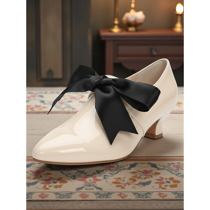 Women's 1920s Vintage Style Beige Patent Faux Leather Low Heel Shoes with Black Bow, Edwardian Elegant Retro Chic Footwear for Parties and Daily Wear