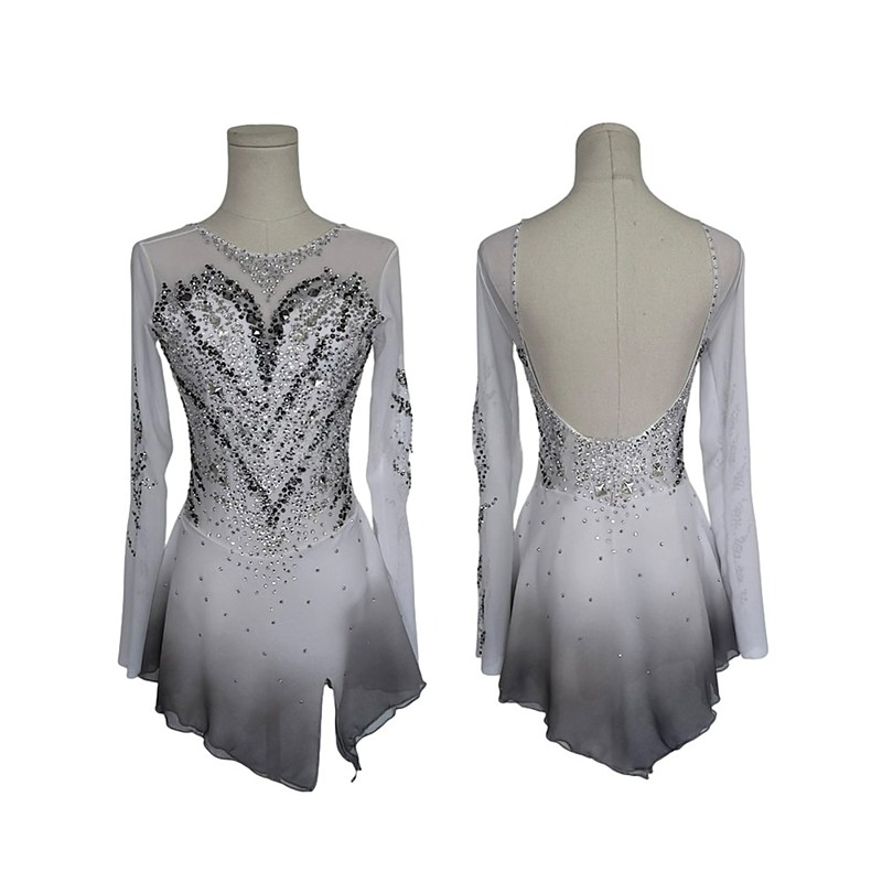 Figure Skating Dress Women's Girls' Ice Skating Dress GrayWhite Patchwork Asymmetric Hem Spandex High Elasticity Training Competition Skating Wear Classic Crystal / Rhinestone Long Sleeve Ice