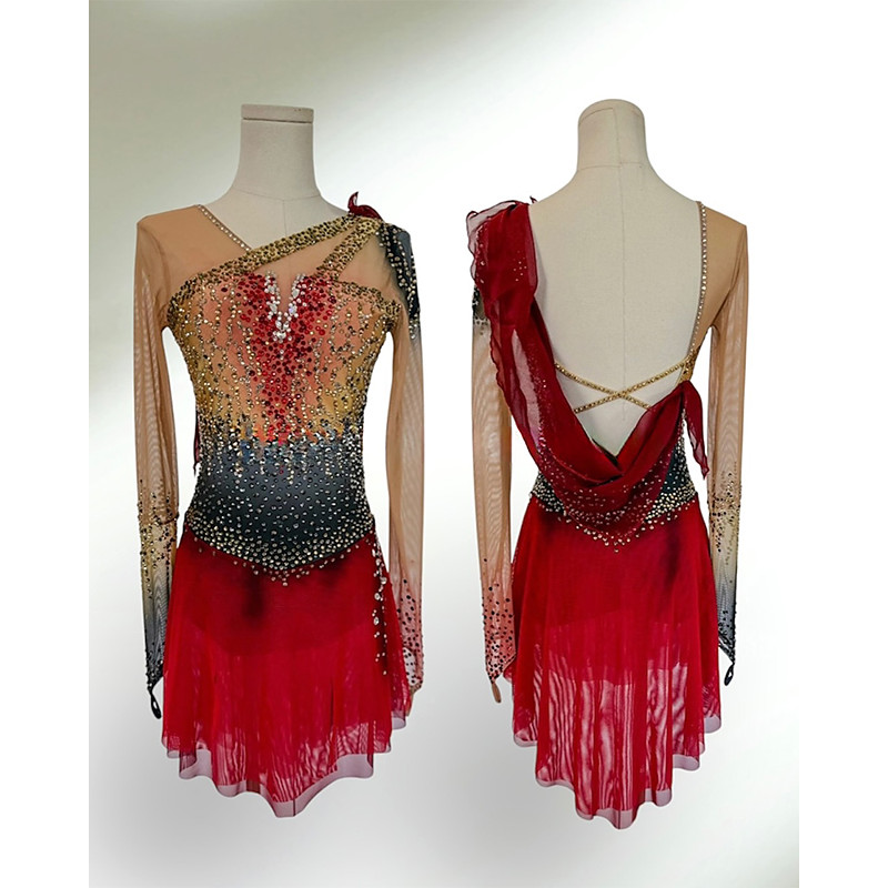Figure Skating Dress Women's Girls' Ice Skating Dress Red Patchwork Thumbhole Spandex Mesh High Elasticity Training Competition Skating Wear Classic Crystal / Rhinestone Long Sleeve Ice Skating