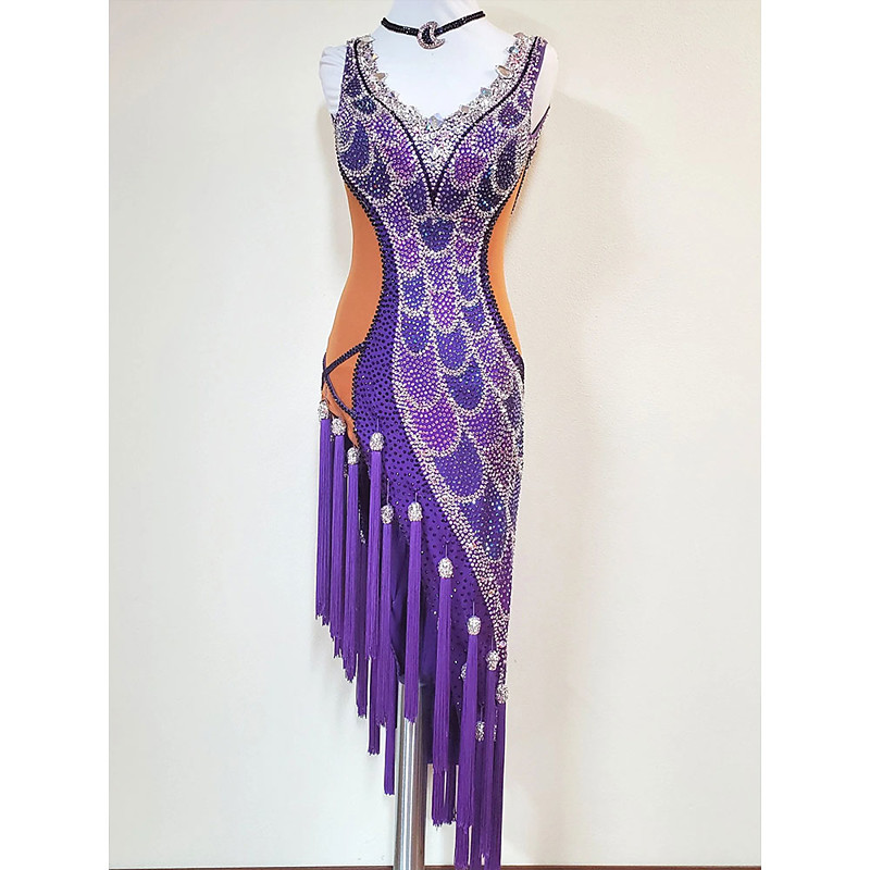 Elegant Women's Latin Dance Dress Purple Crystal Rhinestone Fringe Skirt Nude Mesh Bodycon Competition Samba Rumba Cha Cha Costume