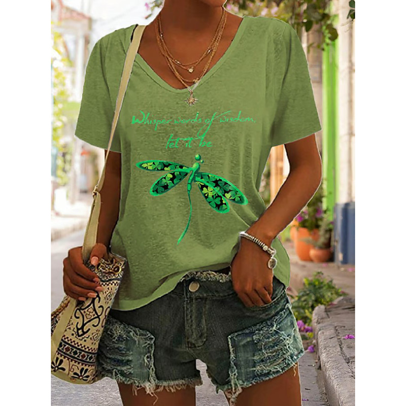 St. Patrick's Day Women's T Shirt Graphic Shamrock Dragonfly Vintage Stylish Classic Short Sleeve V Neck Regular Tops Daily Print Blue Black Green Gray Summer Spring