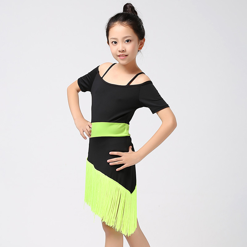 Latin Dance Kids' Dancewear Dress Tassel Splicing Girls' Performance Training Short Sleeve High Cotton Blend