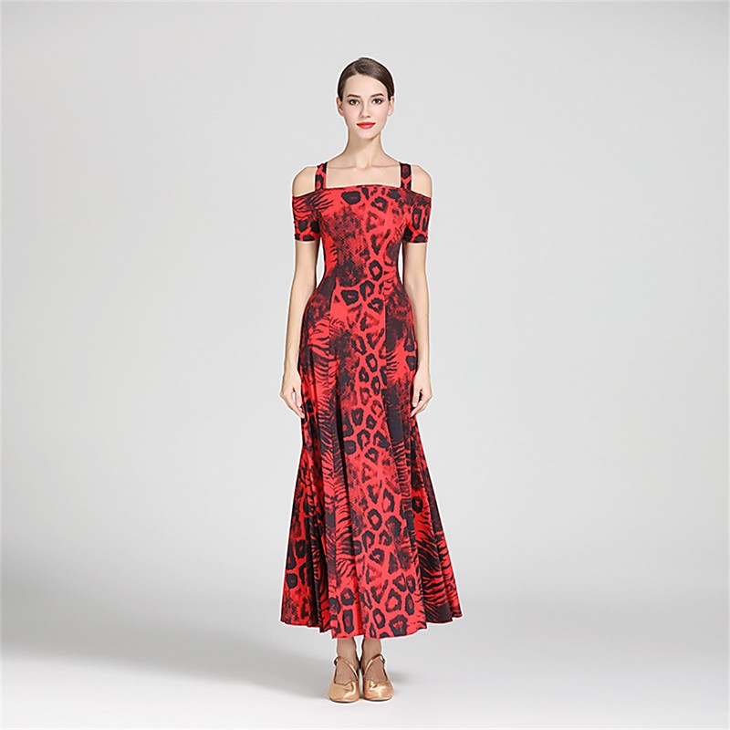 Floral Print Off-Shoulder Ballroom Dance Dress for Women - A-Line Gown for Competitions, Latin, and Dance Events - Red Black