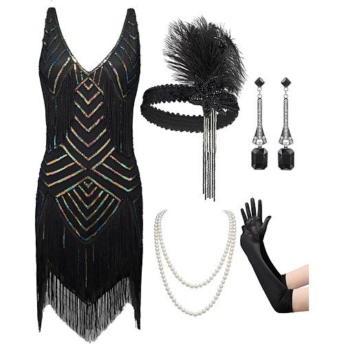 Set Roaring 20s 1920s Cocktail Dress Mini Flapper Dress Dress Outfits with Accessories Sleeveless The Great Gatsby Plus Size Wedding Guest V Neck Fancy Dress Women's Carnival Masquerade Party Evening
