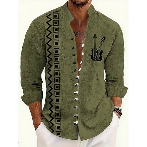 Herren Geometrisches Muster Gitarre Musikinstrument Hemd Stehkragenhemd Langarm Vintage-Retro Lässig Urlaub Frühling Herbst Mandarinkragen Stehkragen Button-Down Leinenähnliches Hemd Blau Orange Grün