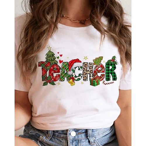 Natale Per donna Blusa Grafico Babbo Natale Albero di Natale Elegante Vintage Tropicale Manica Corta Girocollo Top Regolari Lavoro Quotidiano Ferie Arricciato Patchwork Stampato Bianco e nero Nero