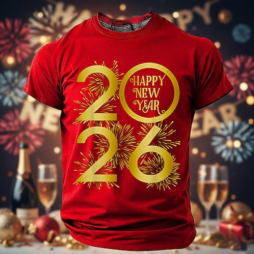 Neujahr Herren glückliches neues Jahr Feuerwerk 2026 T Shirt Kurzarm T-Shirt 3D-Druck Rundhalsausschnitt Hemd Übertrieben Designer Künstlerisch Party Straße Club Blau 1# Schwarz Rote Herbst Winter