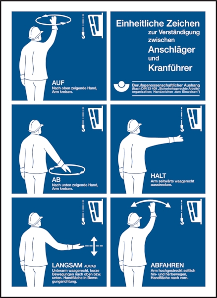 Aushang, Einheitliche Zeichen zur Verständigung zwischen Anschläger und Kranführer - DIN 33409 - 295x405x0.6 mm Aluminium 2 mm