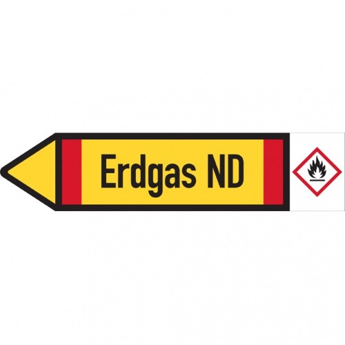 Dreifke® Rohrleitungskennzeichen-Etikett Erdgas ND, links, DIN, gelb/schwarz/rot, ab 90mm Ø, 440x100mm, 2/Bogen