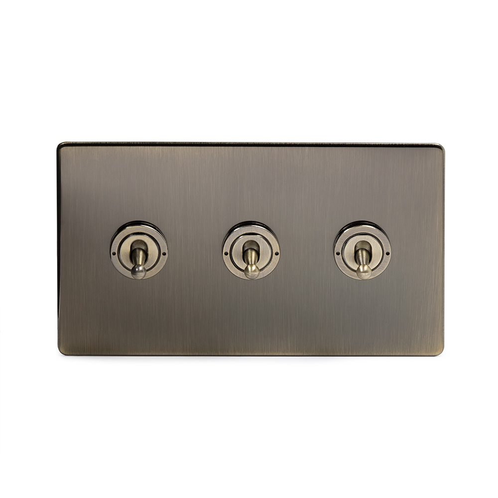 Soho Lighting Antique Brass 3 Gang 2 Way Toggle Switch Screwless - Size: 86mm x 146mm x 4.5mm