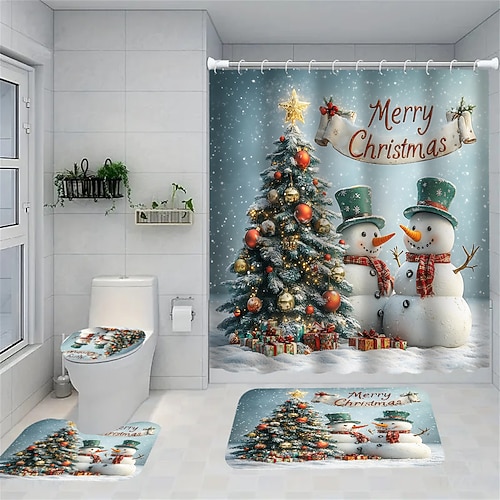 tenda da doccia in quattro pezzi, con sedile del water antiscivolo e robusto e tappetino per il bagno, motivo natalizio con pupazzo di neve e albero di Natale, materiale in poliestere impermeabile con