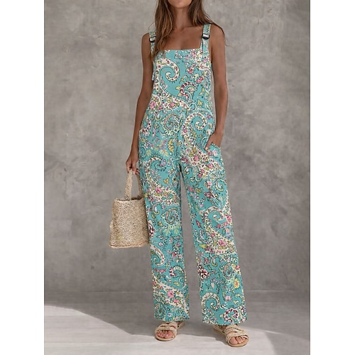 Frauen 100% Baumwolle Latzhosen Aktive Blumendruck Ärmelos Ärmellos Weite Beine Quadrat-Ausschnitt mit Tasche Täglicher Strand Lockerer Schnitt Blau Pink Grün Sommer