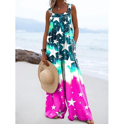 Unabhängigkeitstag Patriotische Damen Latzhosen Aktiv Grafik Ärmellos Weite Beine Quadratischer Ausschnitt Taschen Knöpfe Täglich Strand Lockerer Sitz Rot Lila Orange Sommer
