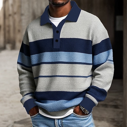 Herren Horizontale Streifen Waffel-Poloshirts Rugby-Poloshirt Rugby-Poloshirts Langarm Polo-Shirts Revers Sportbekleidung Lässig Schule Athleisure Alltagskleidung 3D-Druck Frühling Herbst Winter Blau