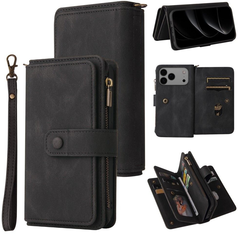 iPhone 17 PURO Eco-Leather Flip Deksel med Kortholder & Stativfunksjon – Svart