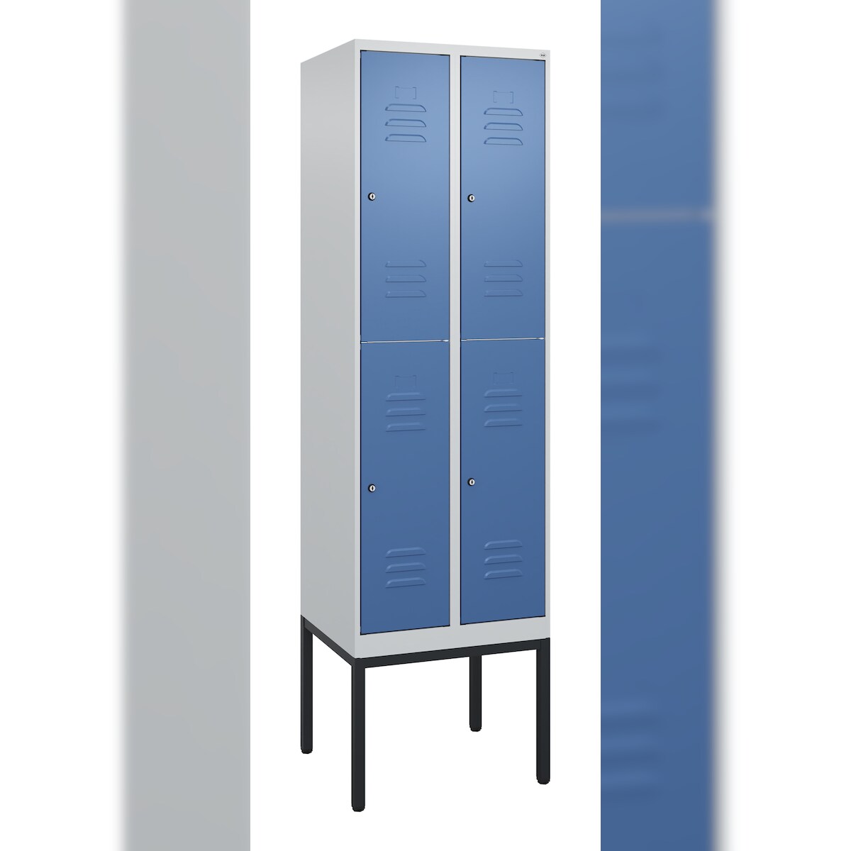 C+P Spind Classic PLUS, Sockel, 4 Abteile, HxBxT 195x100x50cm, Sicherheitsdrehriegel, Hellgrau/Fernblau von PROREGAL