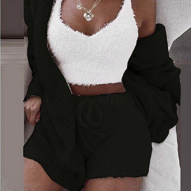 Women's Hooded Pajama Sets 3 Pieces Fluffy Fleece Long Sleeves Coat Shorts Vest for Winter Gift for Valentine's Day