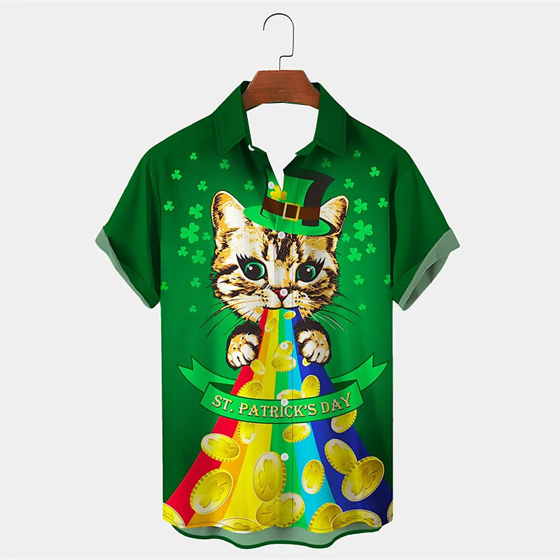 St.Patrick's Day Cat Four Leaf Clover Casual Men's Shirt Daily Wear Going out Weekend Autumn / Fall Turndown Short Sleeves Black, Red, Green S, M, L 4-Way Stretch Fabric Shirt St.