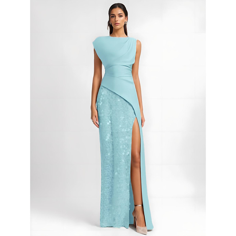A-Line Floor Length Prom Dresses Evening Gown Ball Gown Formal Dress Elegant Glittering High Split Sleeveless Crew Neck Formal Pocket Italy Satin with Glitter Ruched
