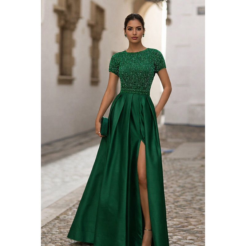 A-Line Floor Length Evening Gown Ball Gown Formal Dress Elegant Vintage Glittering Short Sleeve Jewel Neck Formal Pocket Satin with Rhinestone Glitter Slit