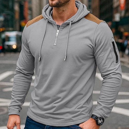 Herren Viertel-Zip T-Shirt T-Shirt Langarmshirt Langarm Mit Kapuze Sommer Herbst Patchwork Täglich Lässig Streetstyle Reißverschluss Outdoor Straße Lässig Schwarz Marineblau Kaki Top T-Shirt für