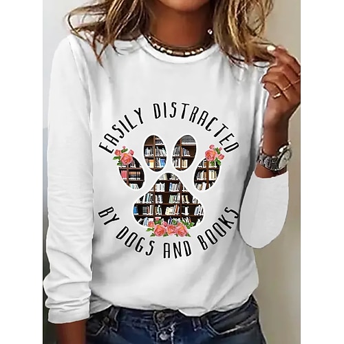 Maglietta da donna con scollo rotondo a maniche lunghe tunica grafica gatto lettera vintage elegante classica top regolari stampa quotidiana weekend bianco nero nero bianco rosa verde primavera