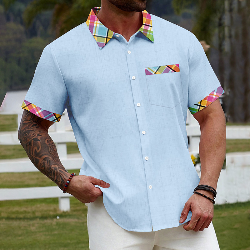 Men's Geometric Check Grid / Plaid Shirt Summer Shirt Button Up Shirt Short Sleeve Fashion Casual Vacation Holiday Streetwear Summer Turndown 3D Print Front One Pocket Linen Like Shirt Pink Blue Green