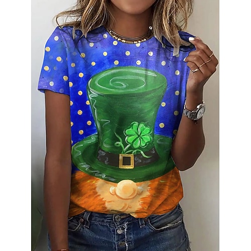 T-Shirt da donna per il giorno di San Patrizio Grafica Quadrifoglio Elegante Classico Casual Maniche Corte Girocollo Collo Rotondo Top Regolari Quotidiani Stampa Blu Arancione Estate Primavera