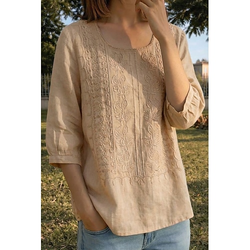 Per donna Maglietta Finto cotone e lino Ricamato Floreale Moda Etnico Casual Mezza Manica Girocollo Top Regolari Uscire Abbigliamento da vacanza Verde acqua Bianco Giallo Viola Cachi Estate Primavera